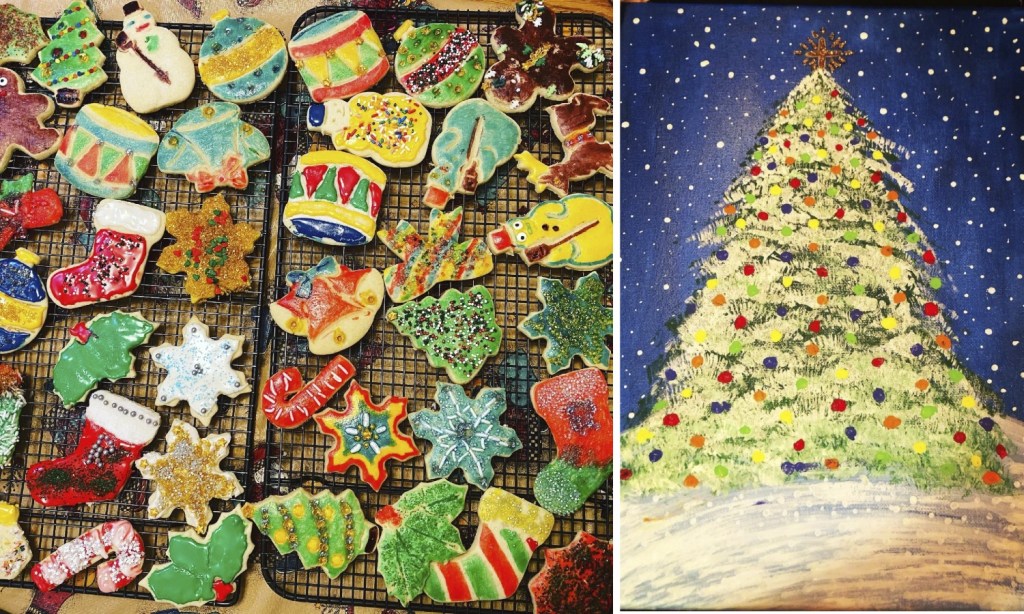 Photo on left: Christmas cookies and photo, both by Jean Wysocki, Westminster, Colo., Dec. 12, 2020. Photo on right: Christmas tree painting and photo, both by Cassandra Phillips-Coleman, Wheat Ridge, Colo., Dec. 20, 2020.