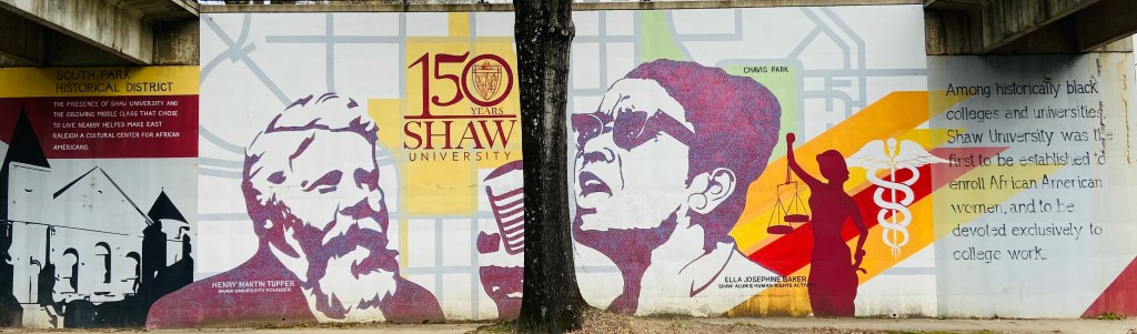 • Estey Hall at Shaw University, also in Raleigh, was the first building constructed in the U.S. for the higher education of African-American women. Founded in 1865, Shaw is the oldest HBCU school — historically black college or university — in the South. For the last couple of days, I’ve been researching and writing this blog in the James E. Cheek Learning Resource Center at Shaw University. The building is named for the 1955 Shaw graduate who became the 13th president of Howard University in Washington, D.C. Shaw is also the alma mater of Ella Baker, who graduated valedictorian in 1927.